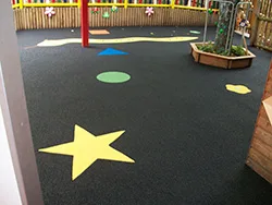 St Wulstan’s nursery playground was transformed with a new wetpour safety surface. The old uneven tarmac was overlaid with wetpour to give a low maintenance surface with an even finish perfect for the children to play on with their bikes and trikes. To brighten the new nursery surfacing the staff chose colourful graphics to add to the black wetpour. A design was created so the nursery staff could approve the layout, colours and size of their chosen graphics before work commenced. The basic shapes and 1-10 numbered snake gave the surface an educational touch.